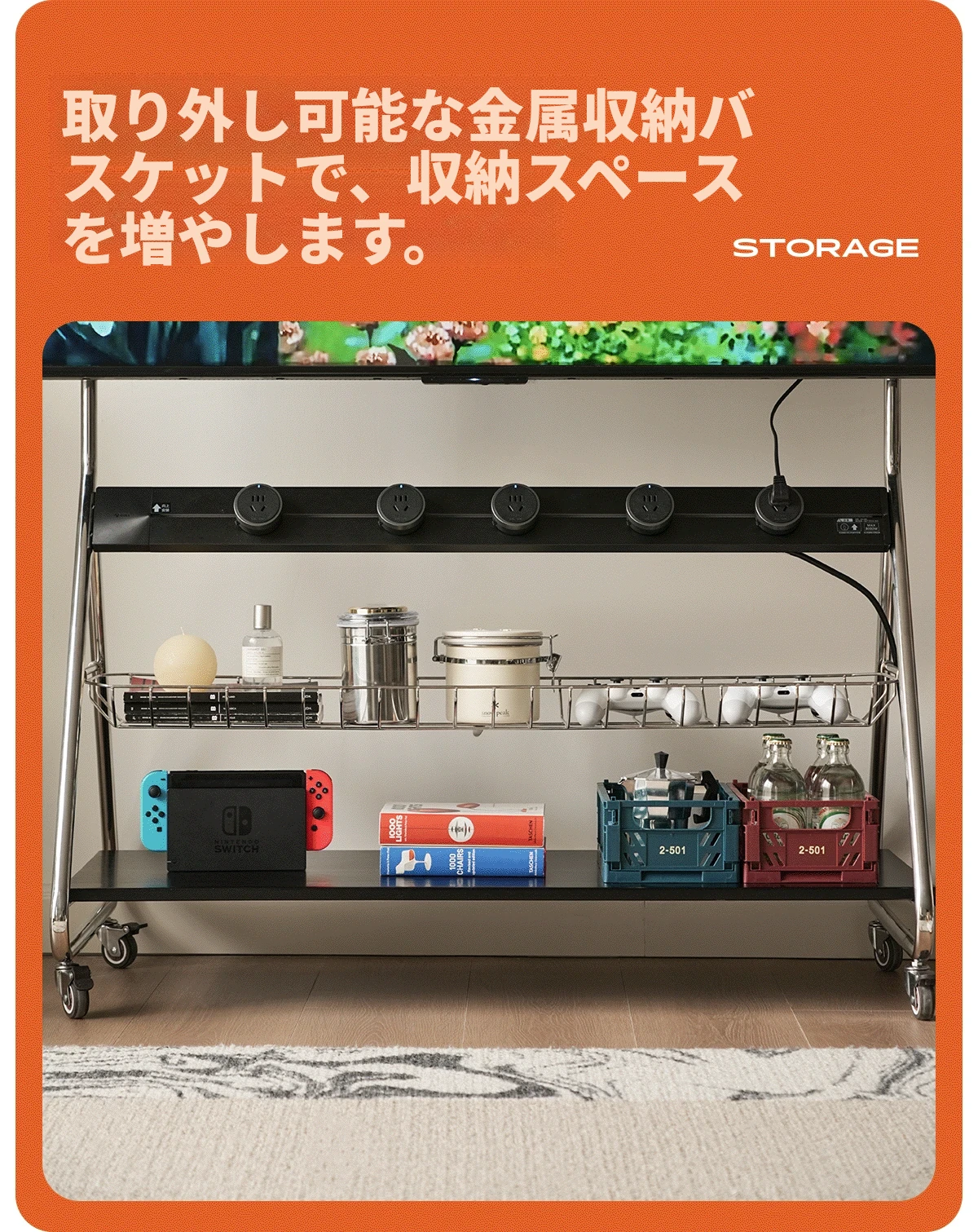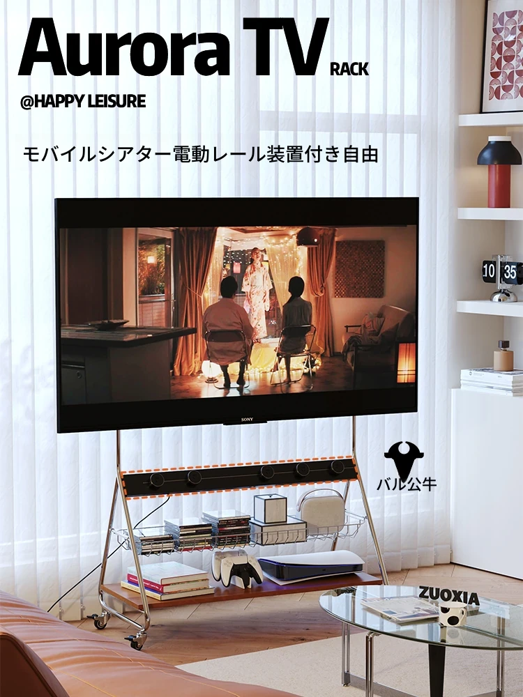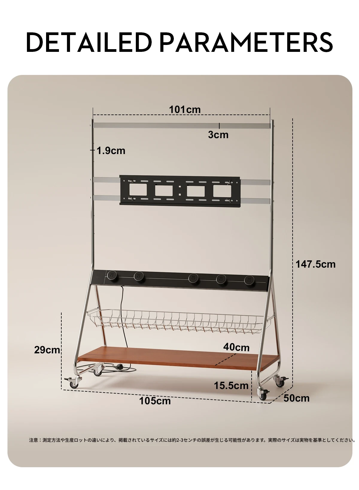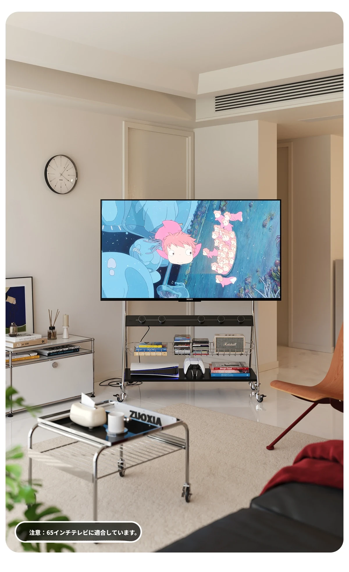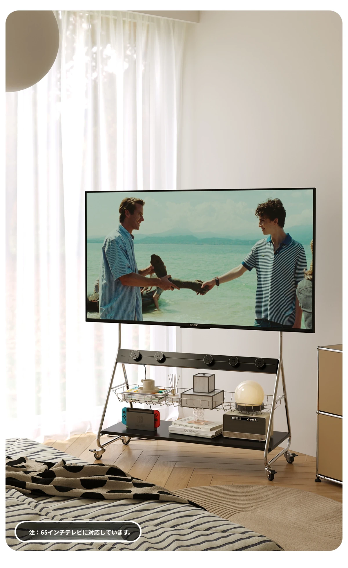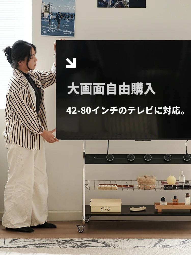 北欧風の可動式テレビスタンド - 小型リビングにもぴったり!電源トラック付きで便利なテレビキャビネット&キャスター付き。おしゃれなデザインで、快適な視聴体験を実現します!