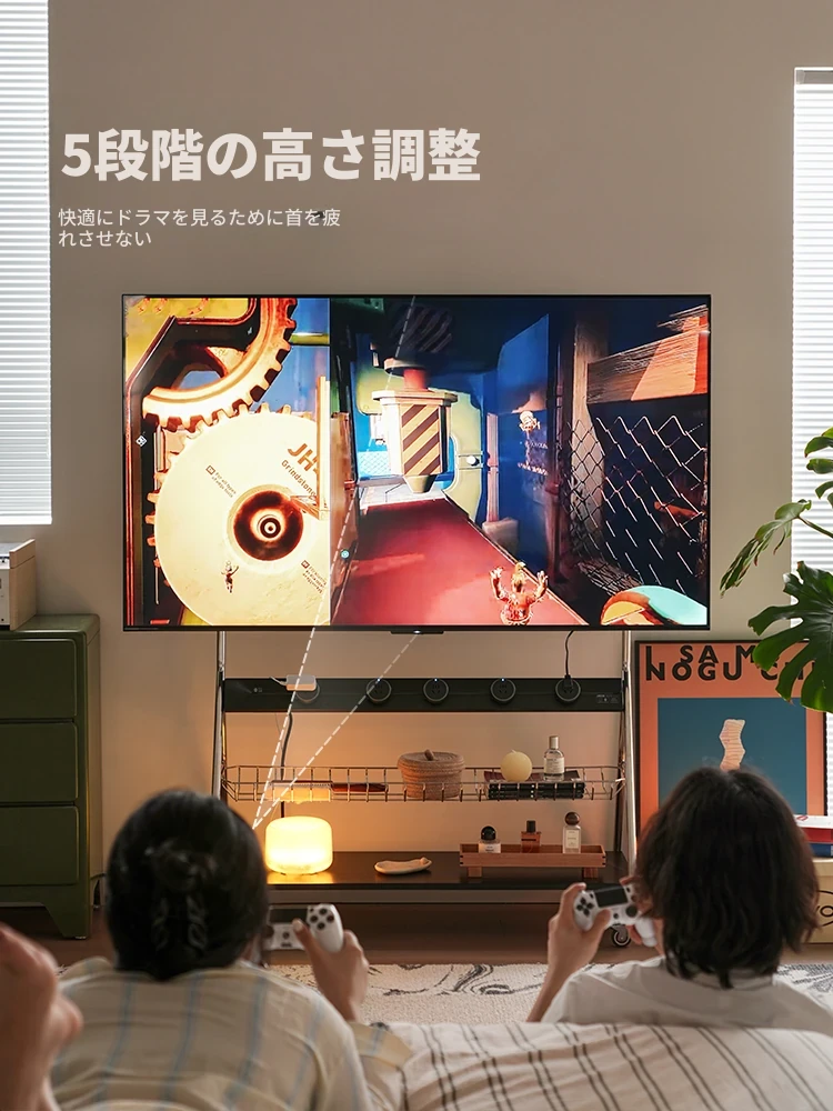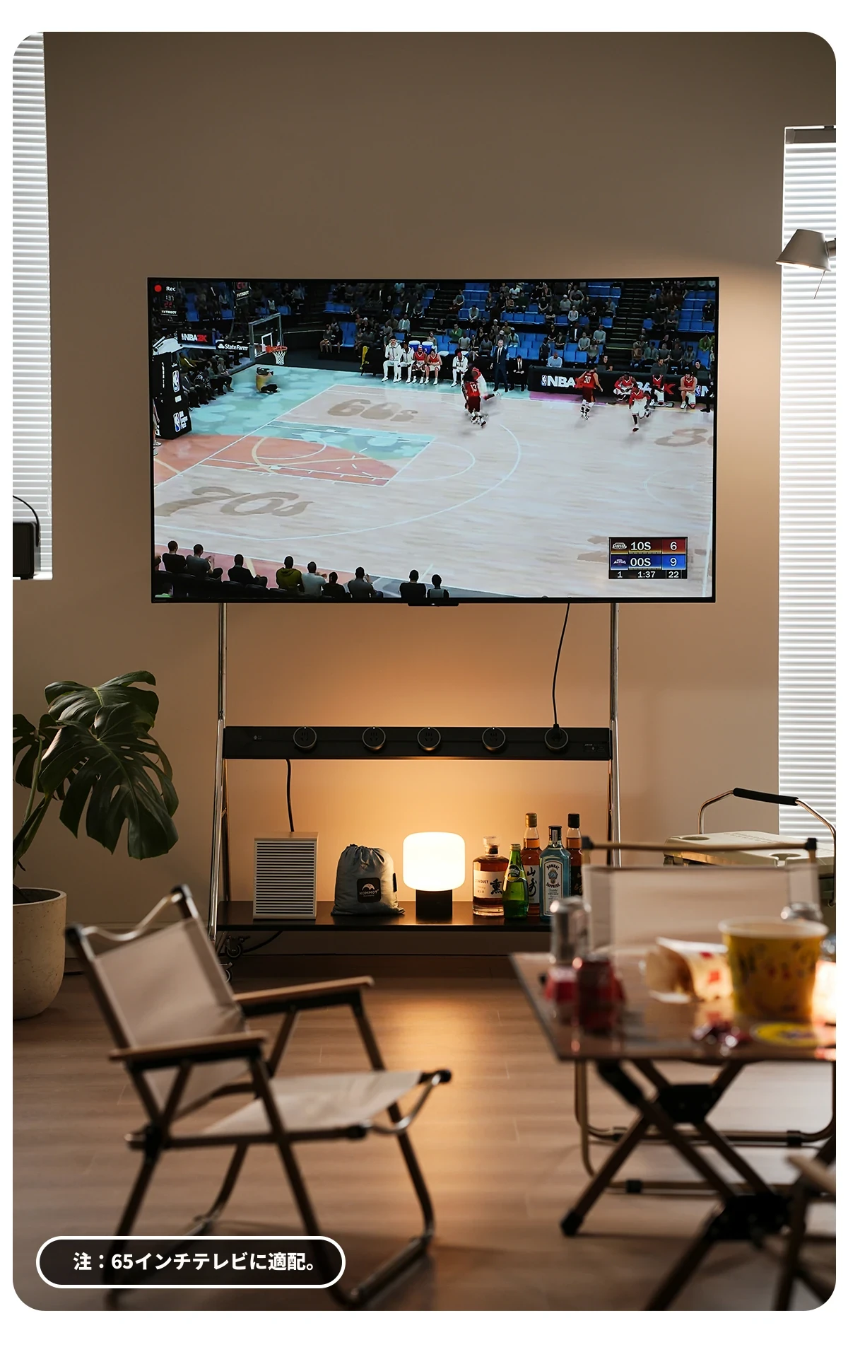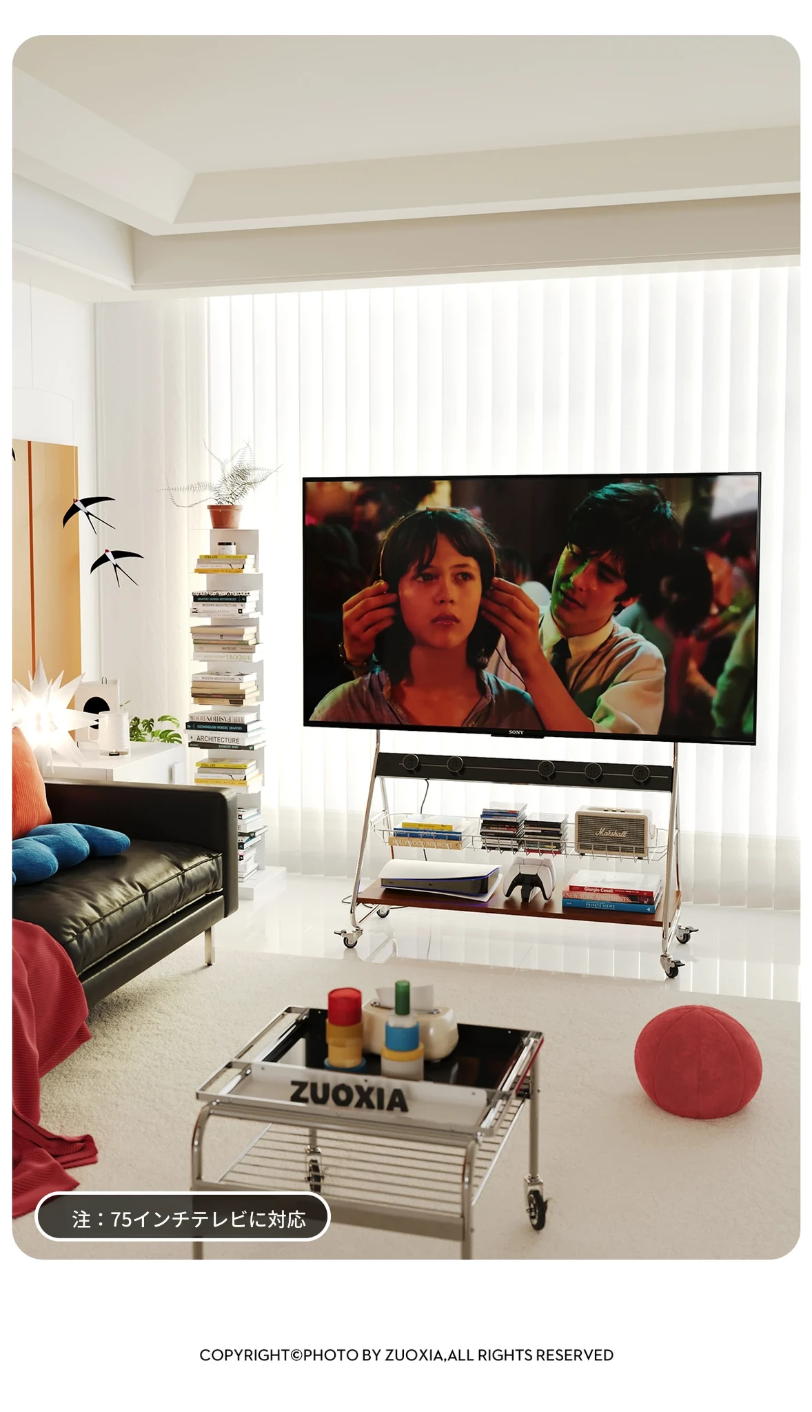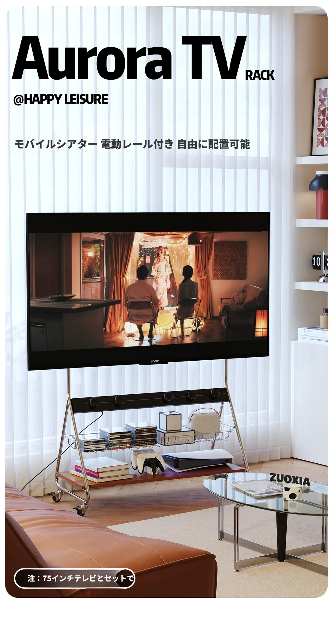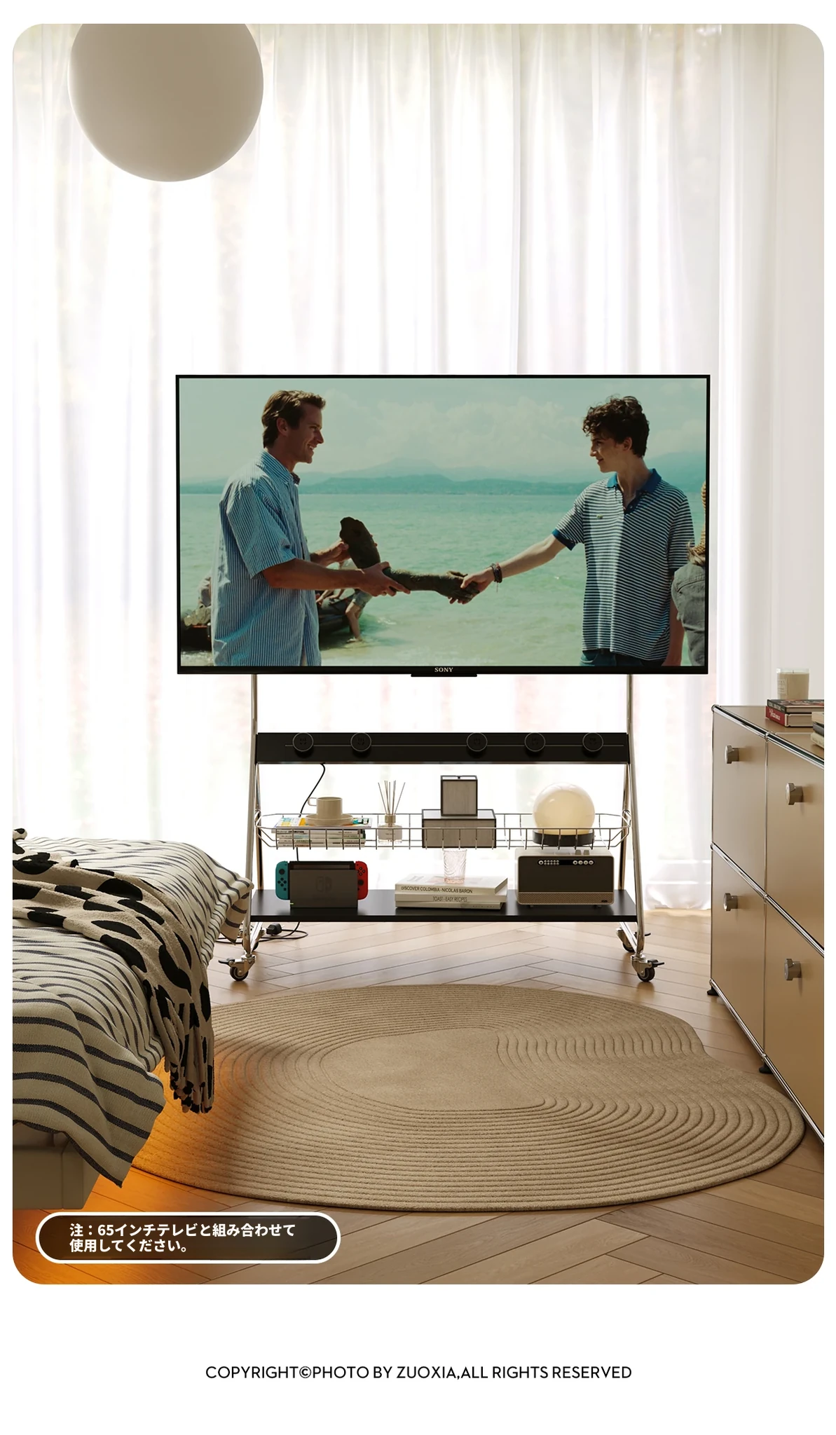 北欧風の可動式テレビスタンド - 小型リビングにもぴったり!電源トラック付きで便利なテレビキャビネット&キャスター付き。おしゃれなデザインで、快適な視聴体験を実現します!