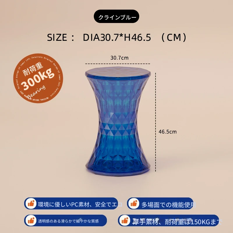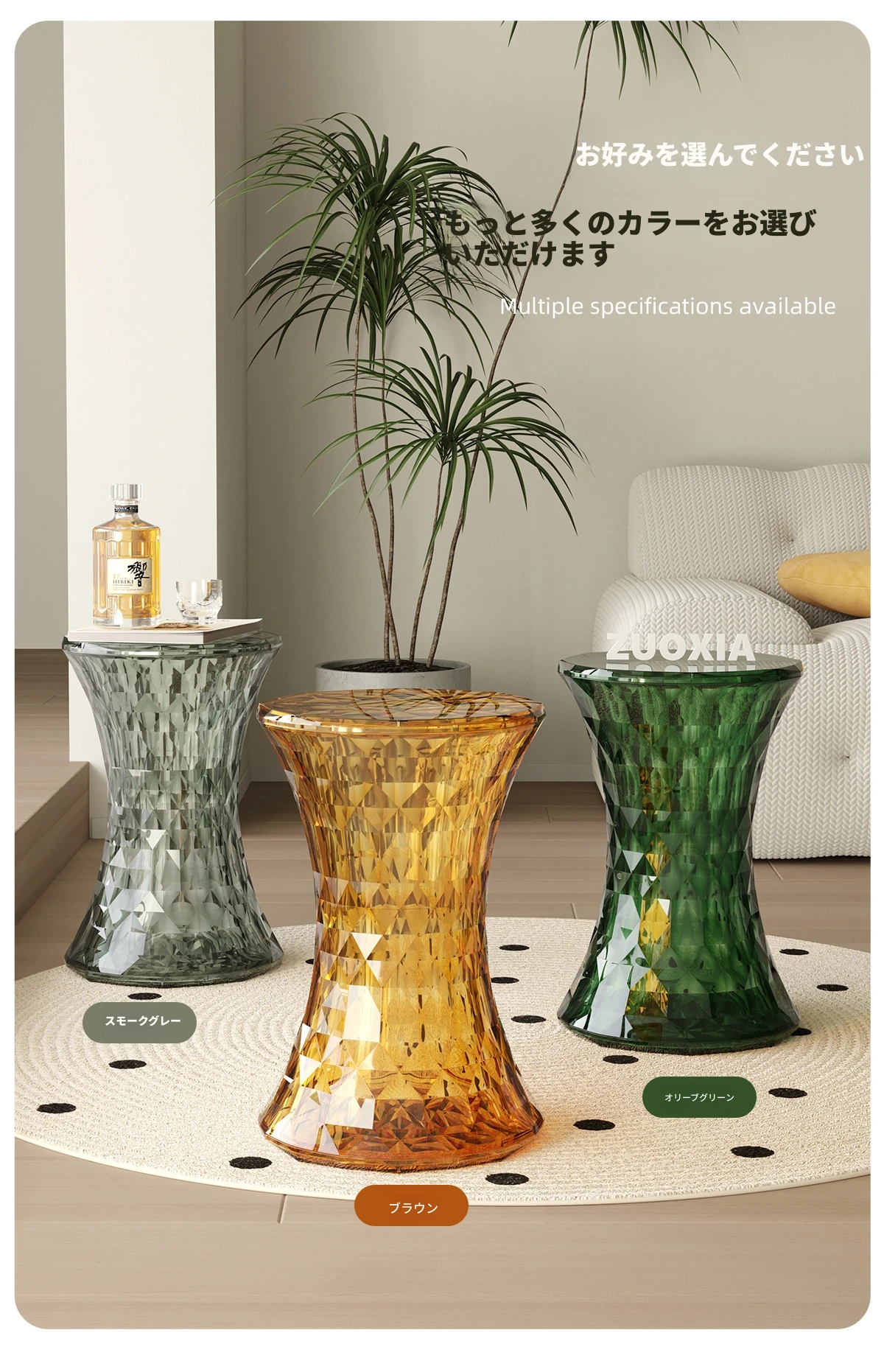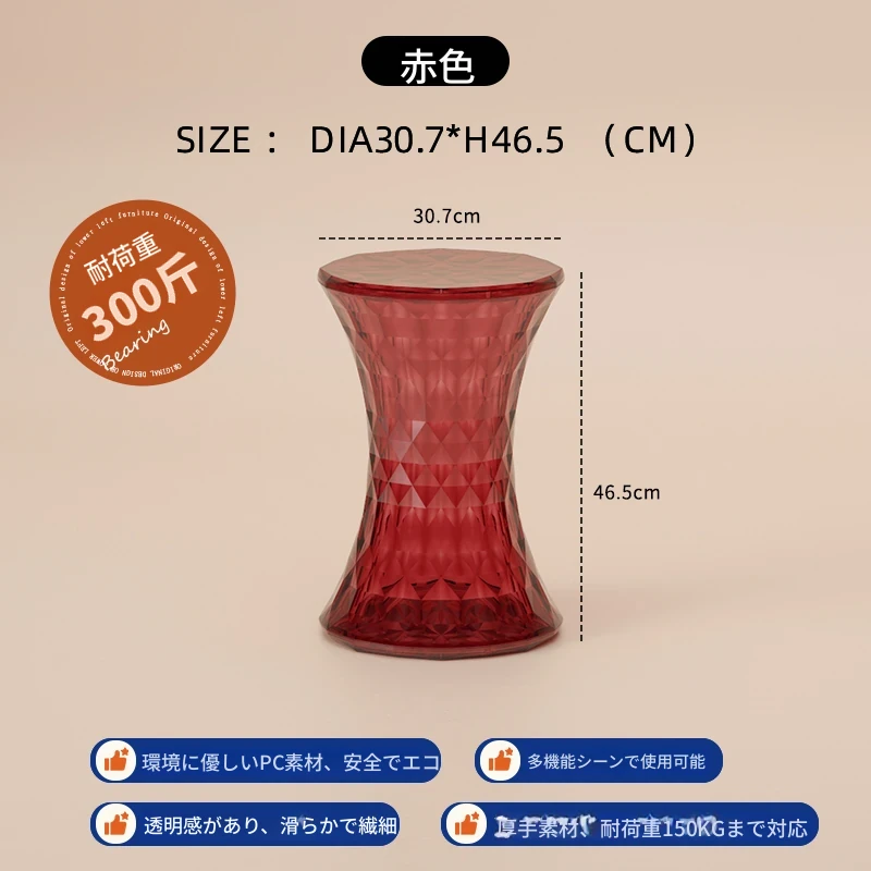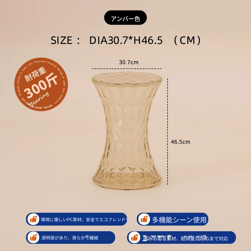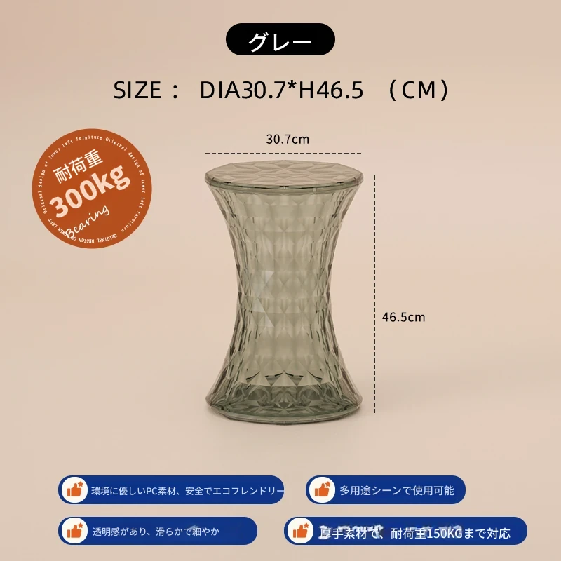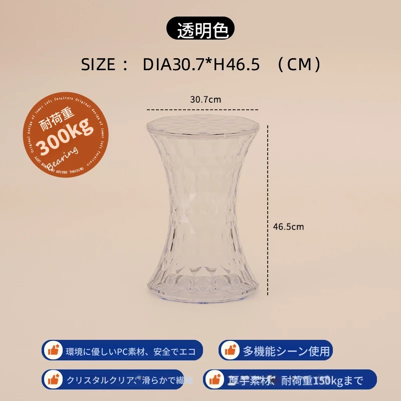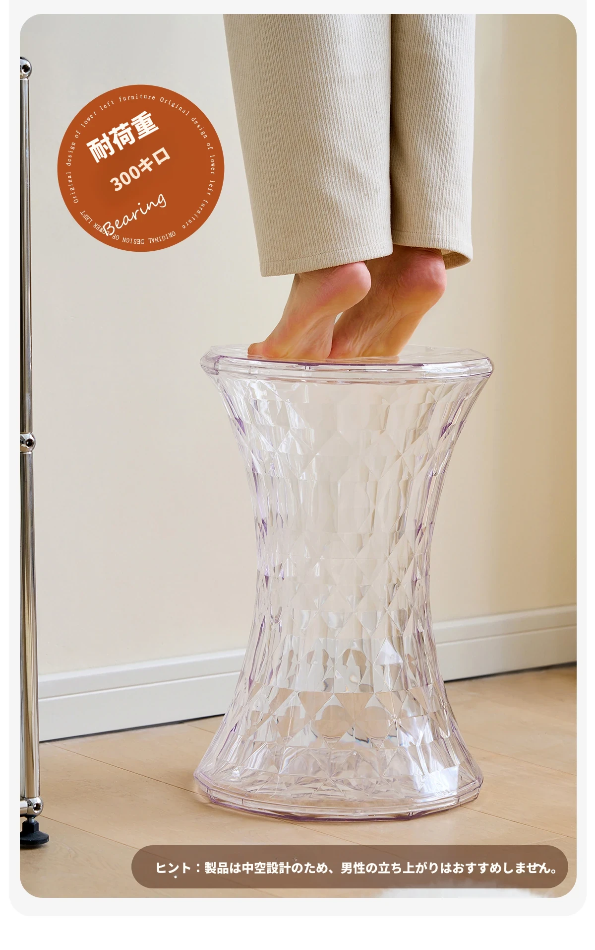 左下インフルエンサーおすすめ化粧台スツール - アクリル製のシンプルでおしゃれな透明クリスタル円形スツール、靴を履く時やメイク時に最適!あなたの部屋に洗練された雰囲気をプラスします。