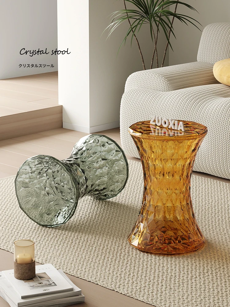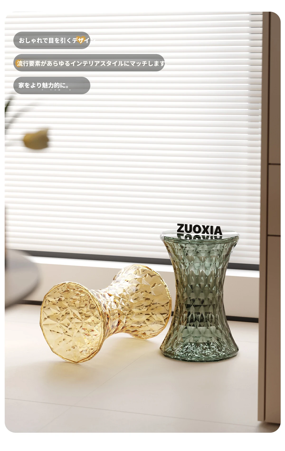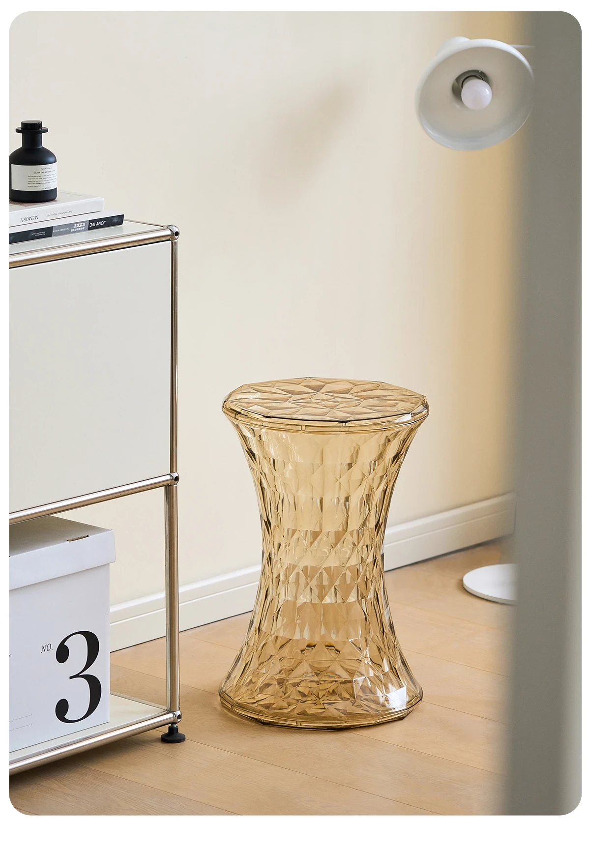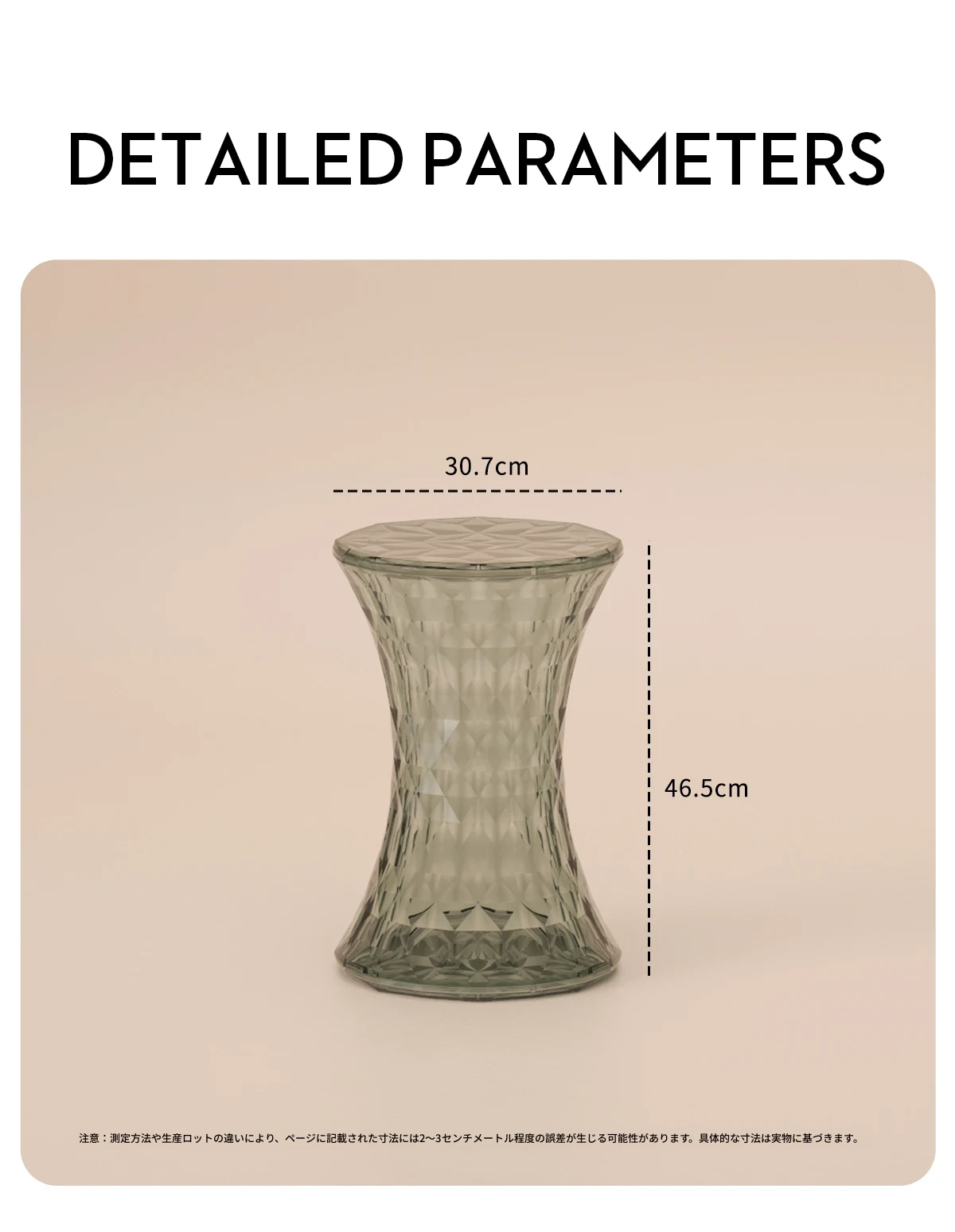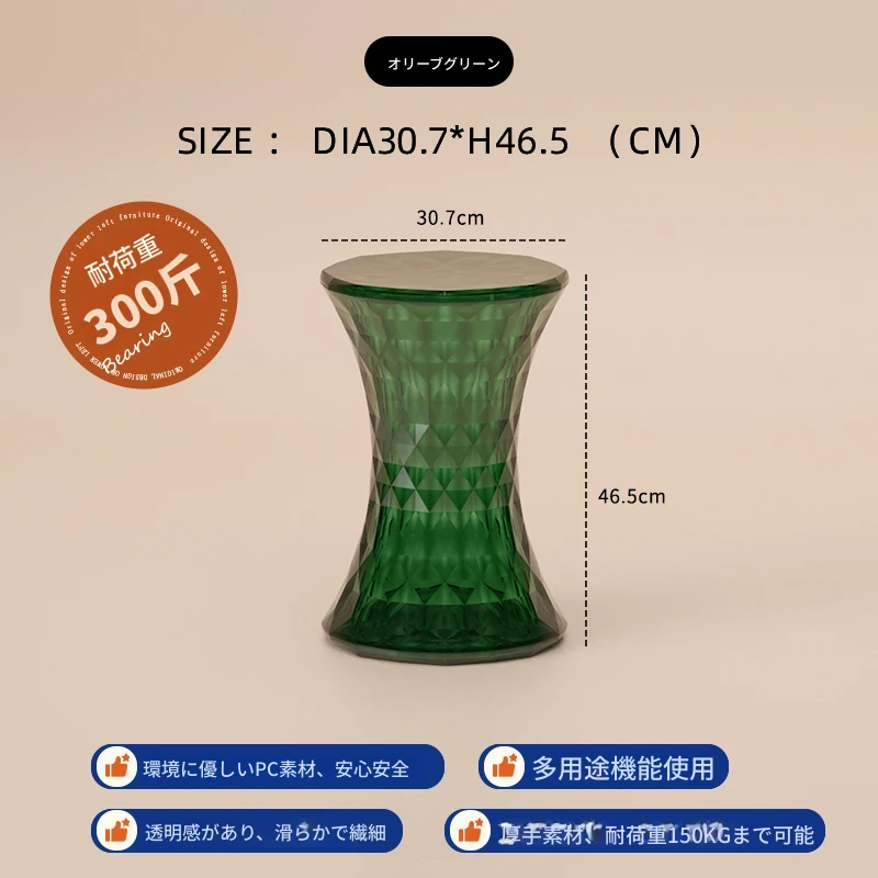 左下インフルエンサーおすすめ化粧台スツール - アクリル製のシンプルでおしゃれな透明クリスタル円形スツール、靴を履く時やメイク時に最適!あなたの部屋に洗練された雰囲気をプラスします。