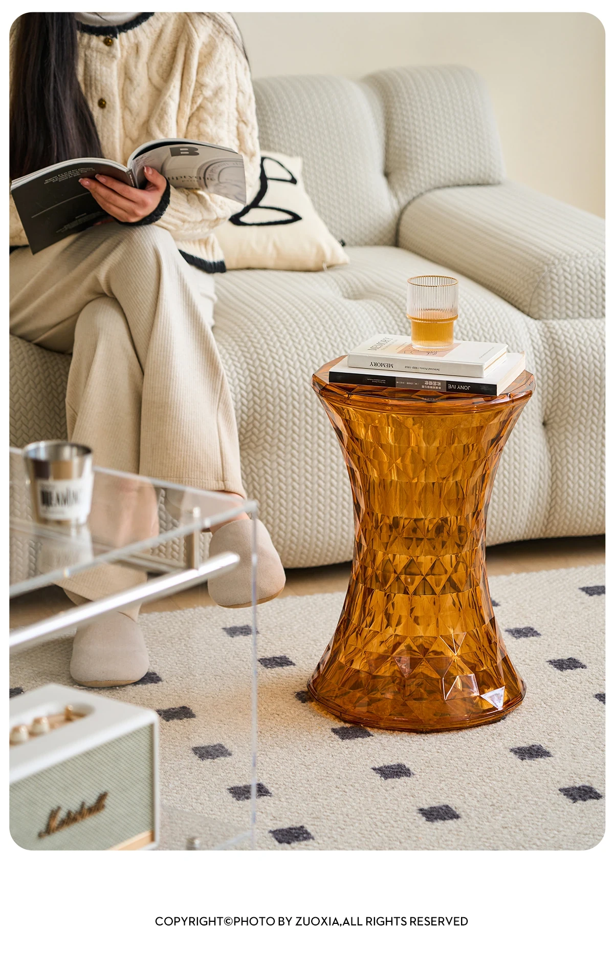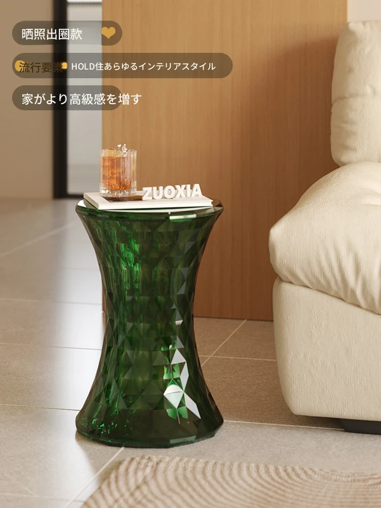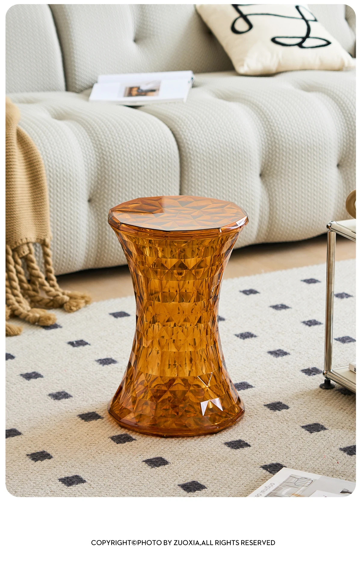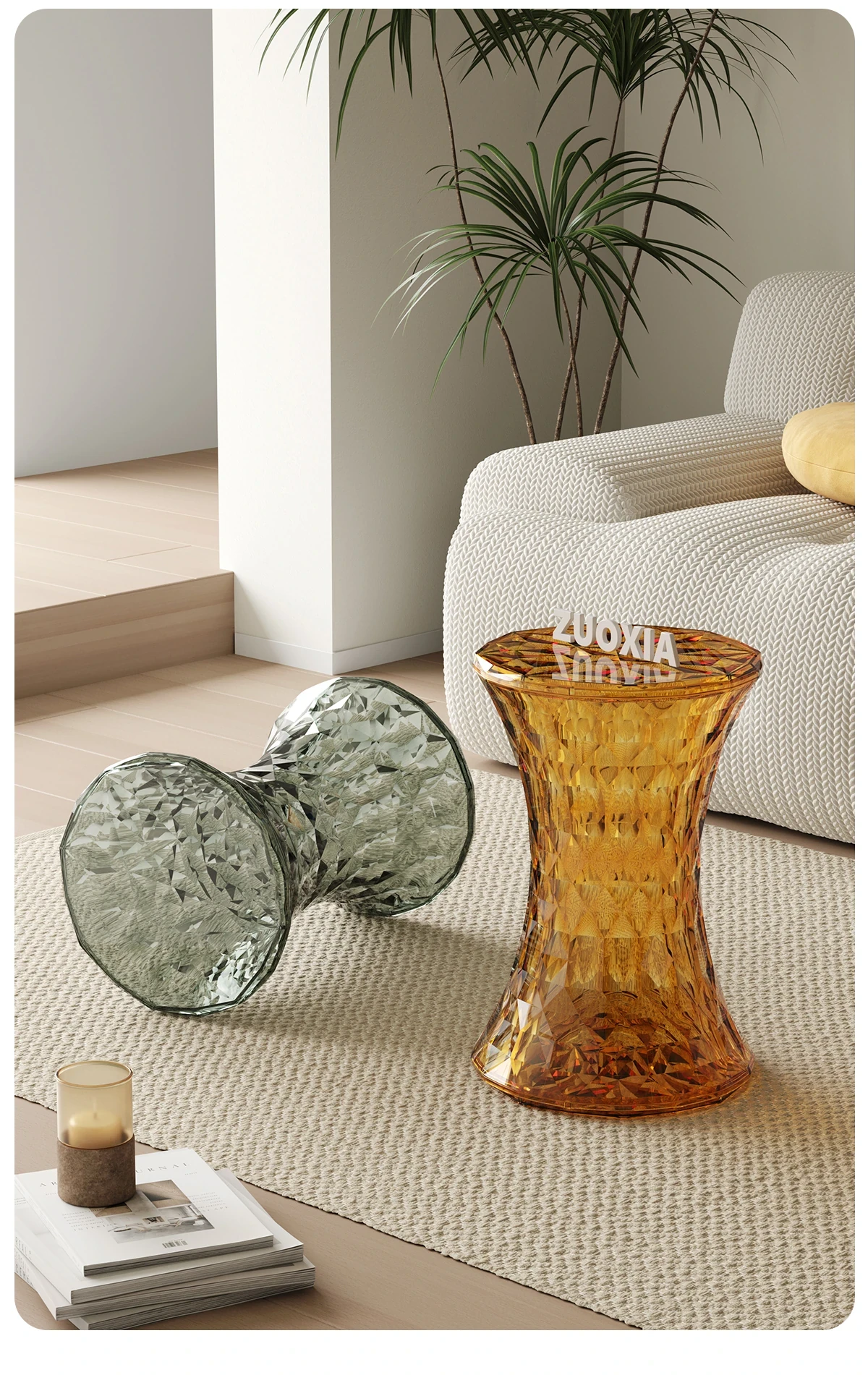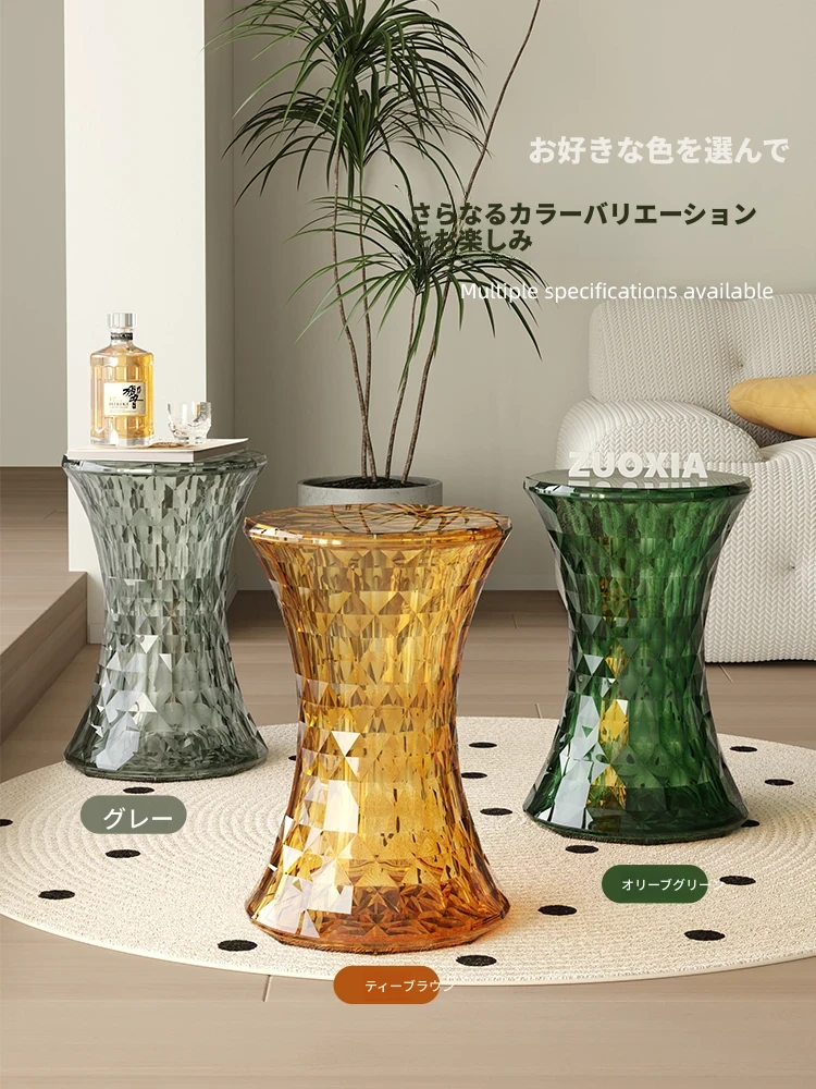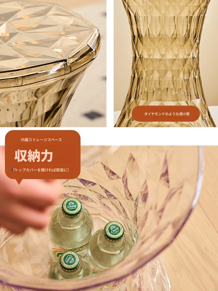 左下インフルエンサーおすすめ化粧台スツール - アクリル製のシンプルでおしゃれな透明クリスタル円形スツール、靴を履く時やメイク時に最適!あなたの部屋に洗練された雰囲気をプラスします。