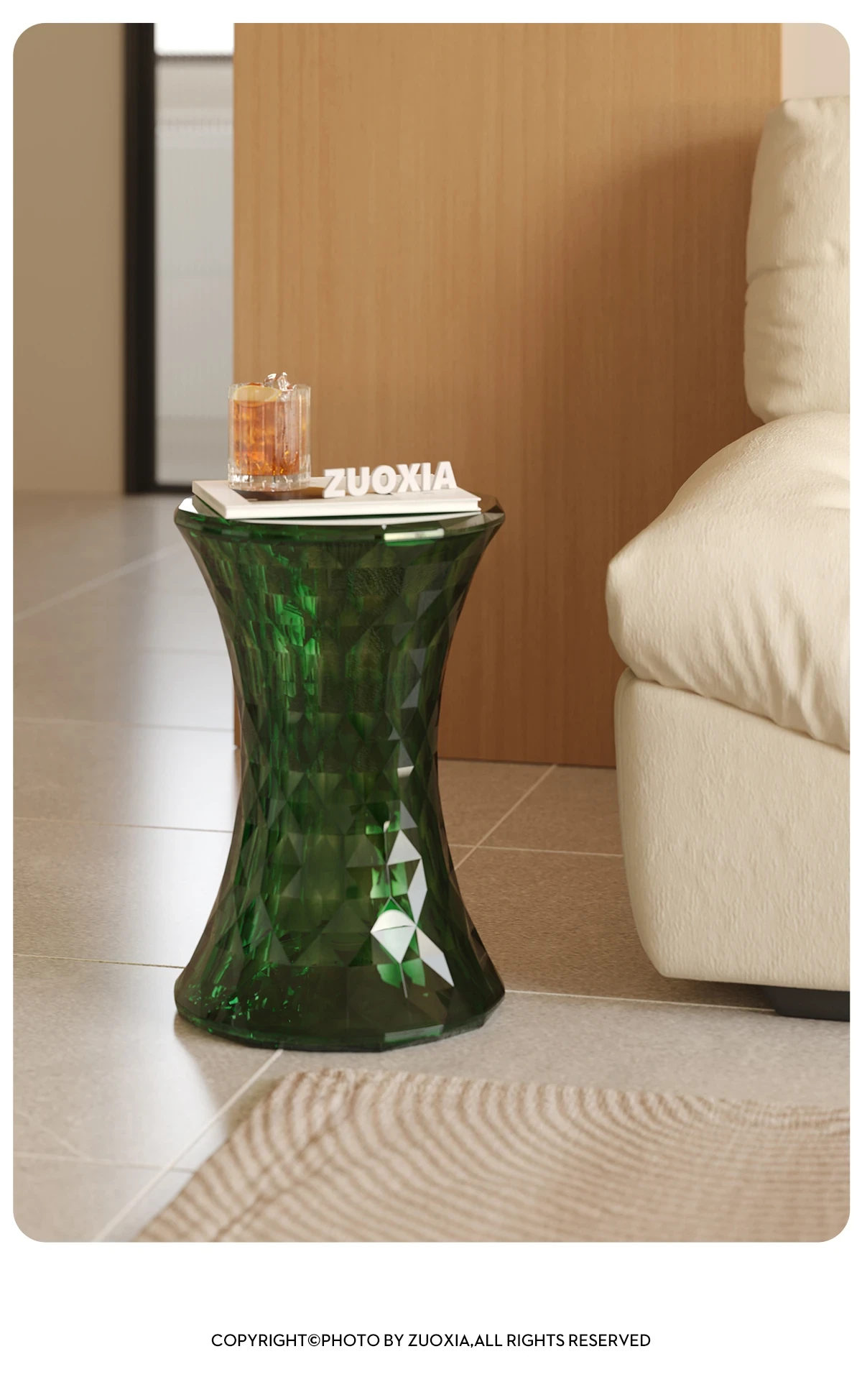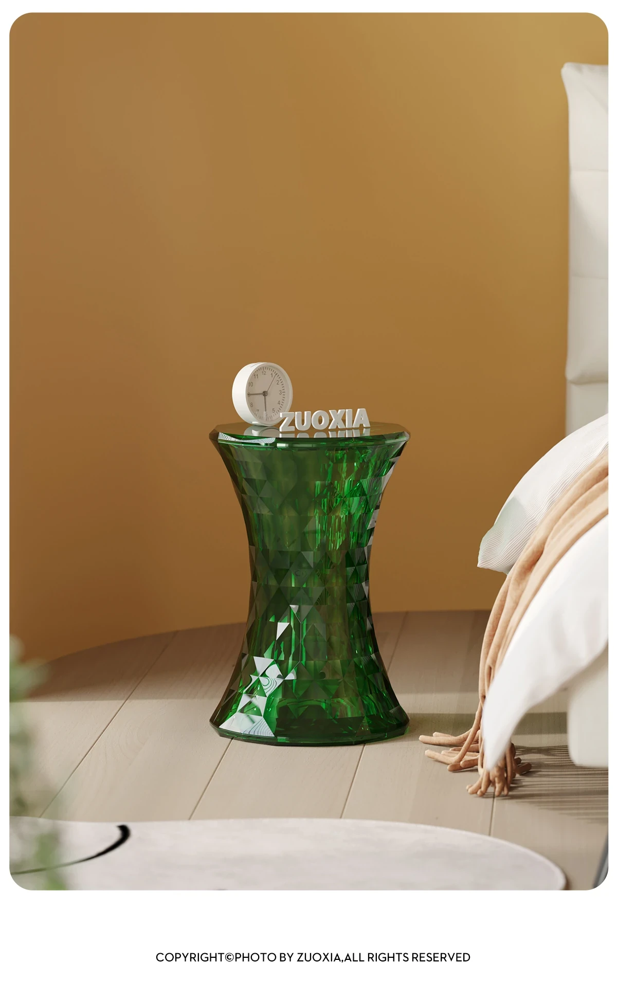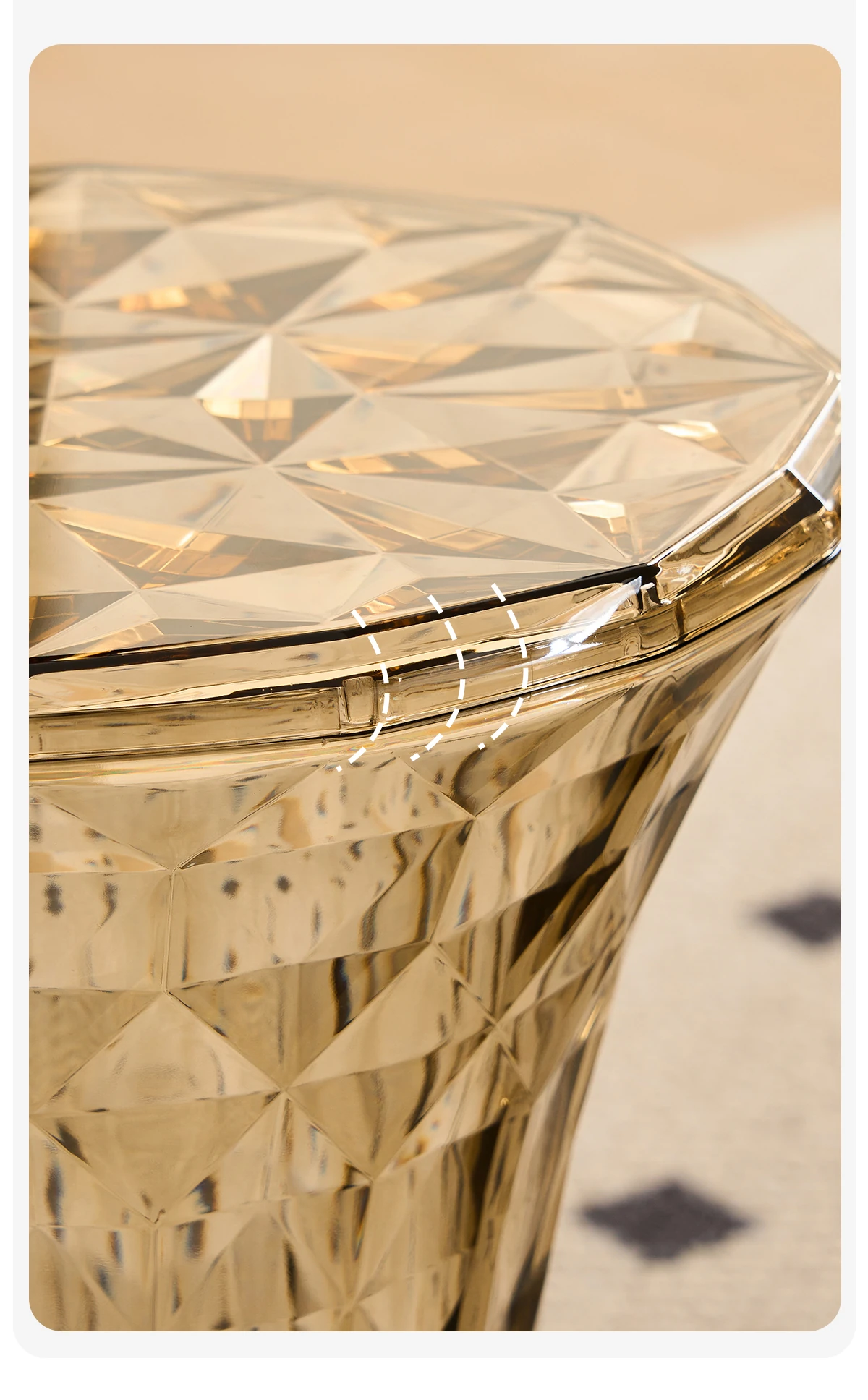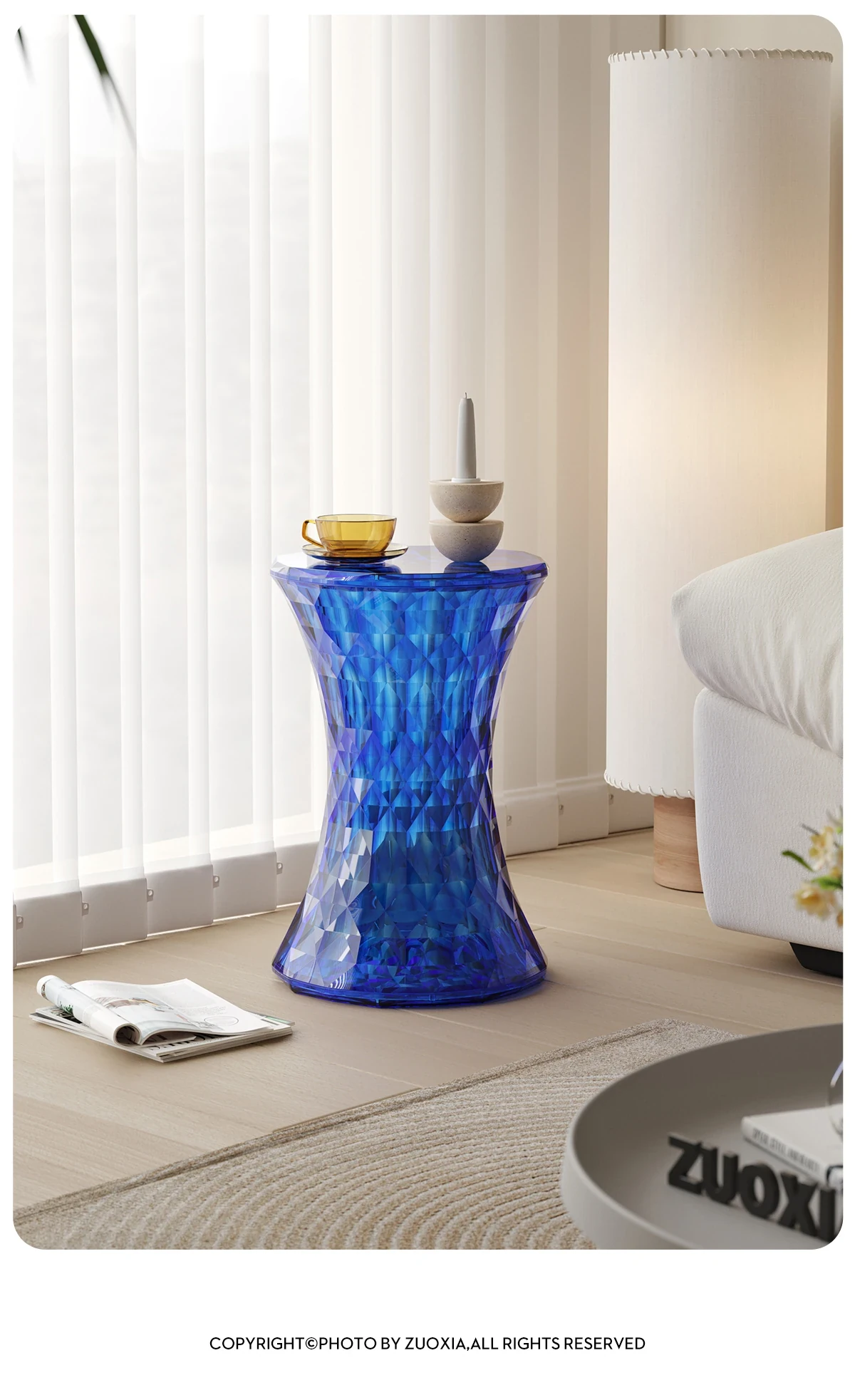 左下インフルエンサーおすすめ化粧台スツール - アクリル製のシンプルでおしゃれな透明クリスタル円形スツール、靴を履く時やメイク時に最適!あなたの部屋に洗練された雰囲気をプラスします。
